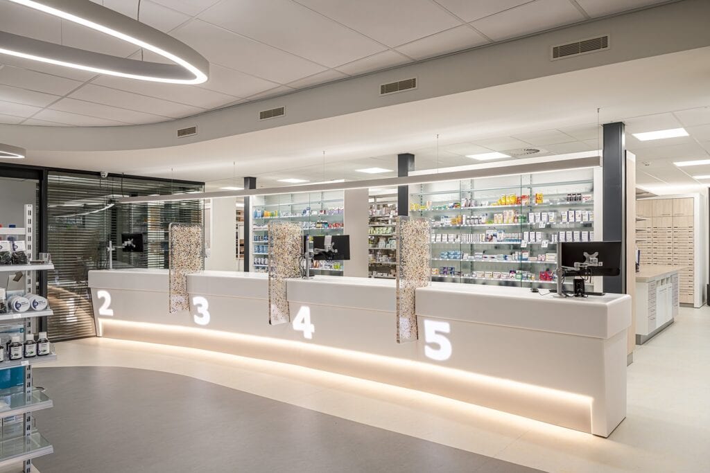 Apotheken: naadloze balies en werkbladen voor een hygiënische uitstraling.